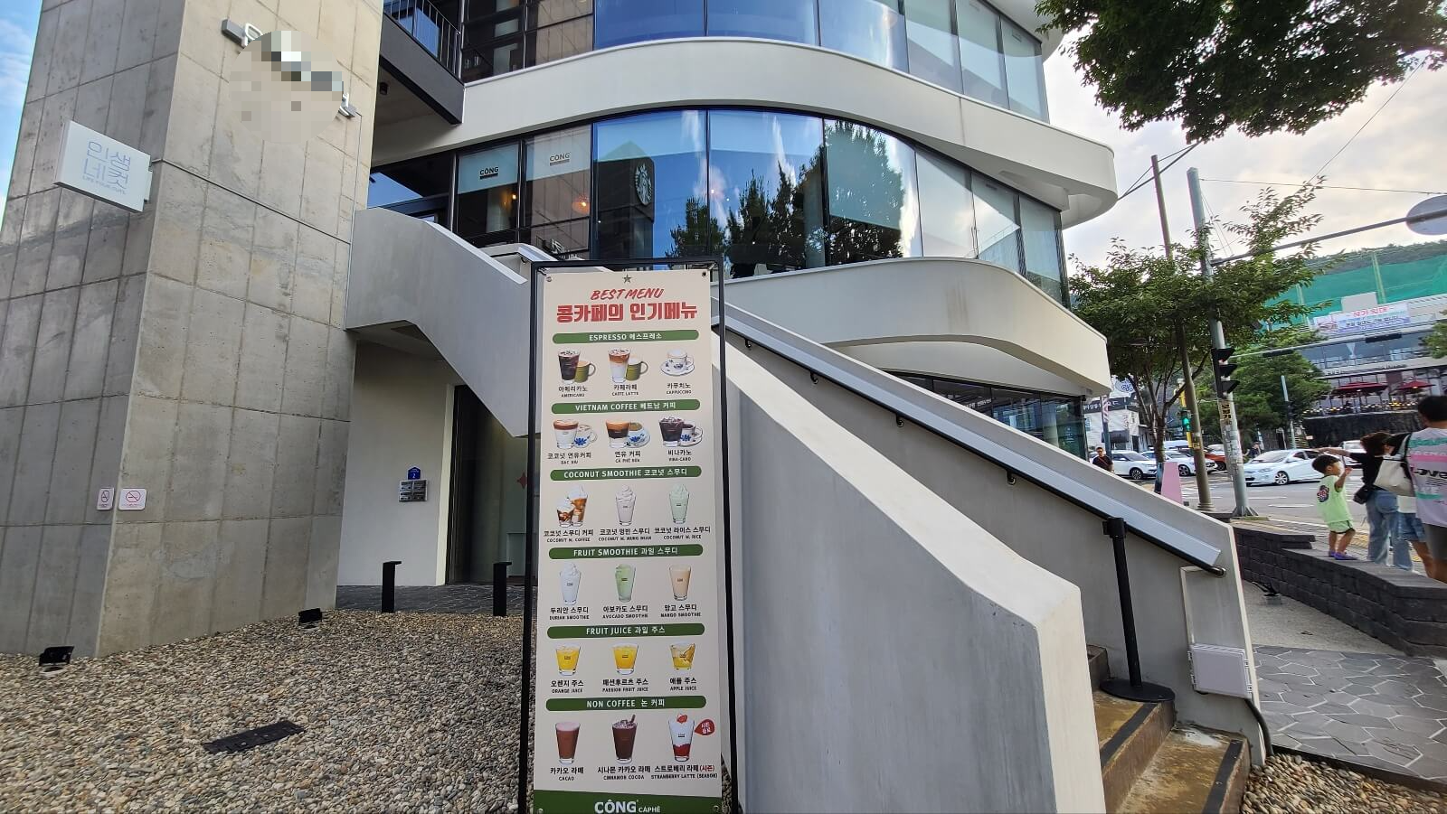 1층은 스티커 사진을 찍는 다른 가게이고 2층부터 콩카페입니다. 계단을 올라가셔도 되지만 계단 뒤쪽에 마련된 엘리베이터를 타고 쓩 올라가셔도 됩니다. 입구에서 메뉴룰 바로 확인할 수 있습니다.