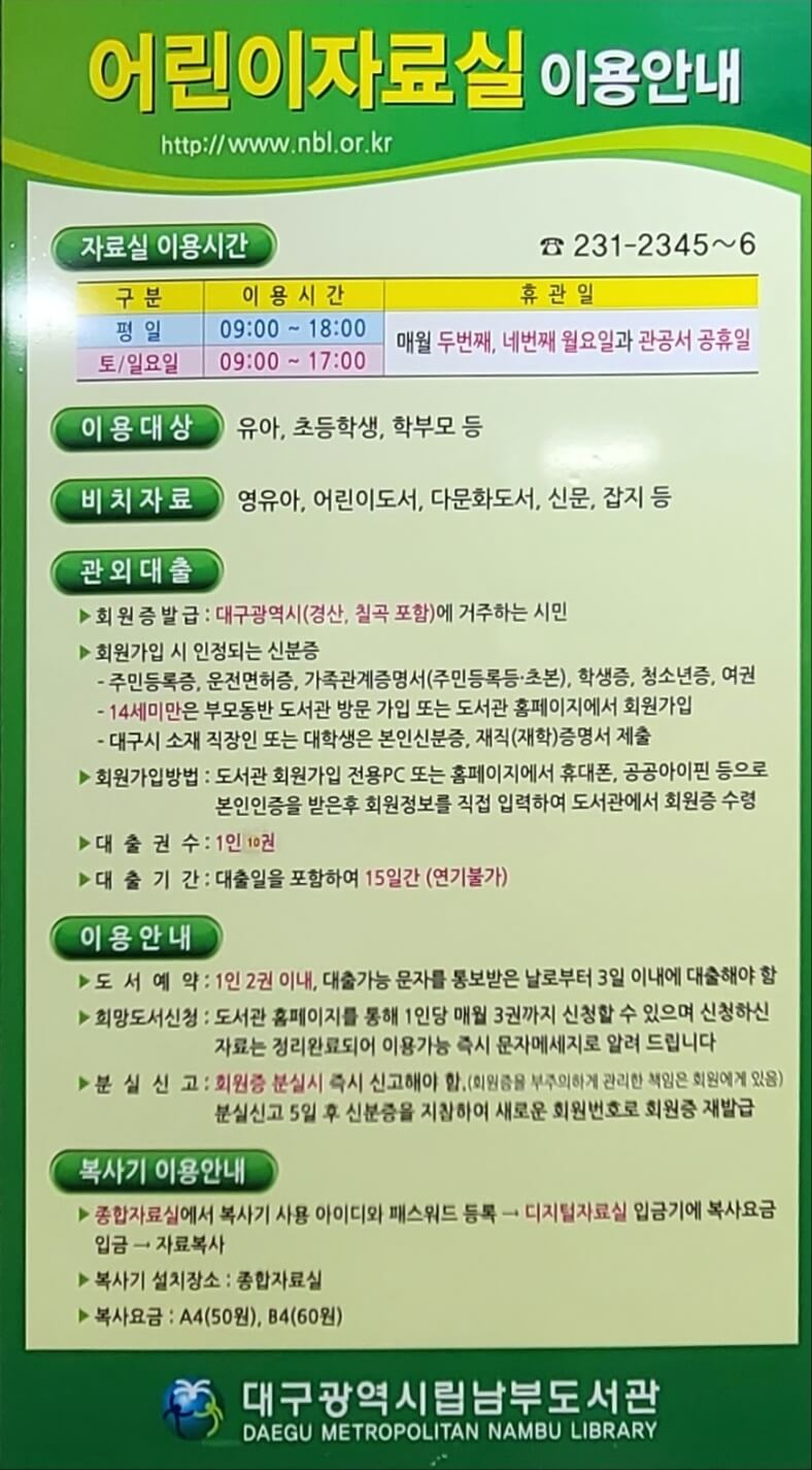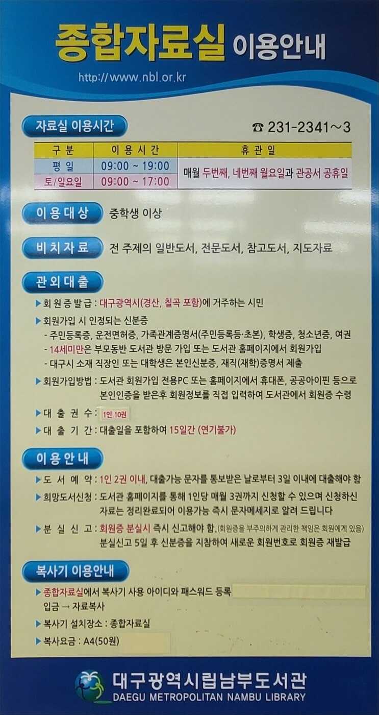 운영시간:매일 09:00 - 19:00 토, 일요일 17시까지 (4층 열람실은 밤 10시까지)