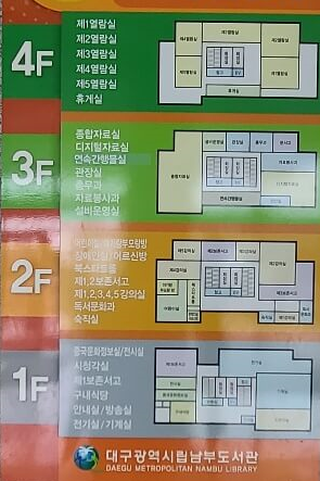 남부 도서관은 4층 열람실에서 오전 9시부터 밤 10시까지 장시간 공부할 수 있다는 것이 가장 큰 장점인 것 같습니다. 반면에 주차장이 있지만 오전 9시 이전에 도착하지 않으면 주차 공간이 없어 이용에 불편이 있다는 점이 또한 단점입니다. 도서 반납과 대출을 위해 오신다면 자칫 주차 때문에 어려움을 겪을 수 있다는 점을 숙지하시고 주변 공영주차장을 이용하신다는 결심 또는 대중교통을 이용하겠다는 마음 가짐으로 오신다면 산속에 공기 좋고 공간이 넓어 최적한 도서관을 이용하실 수 있습니다. 매점 또한 운영이 잘 되어서 하루종일 독서에만 집중하수 있는 도서관. 한번 방문해 보시면 어떨까요?