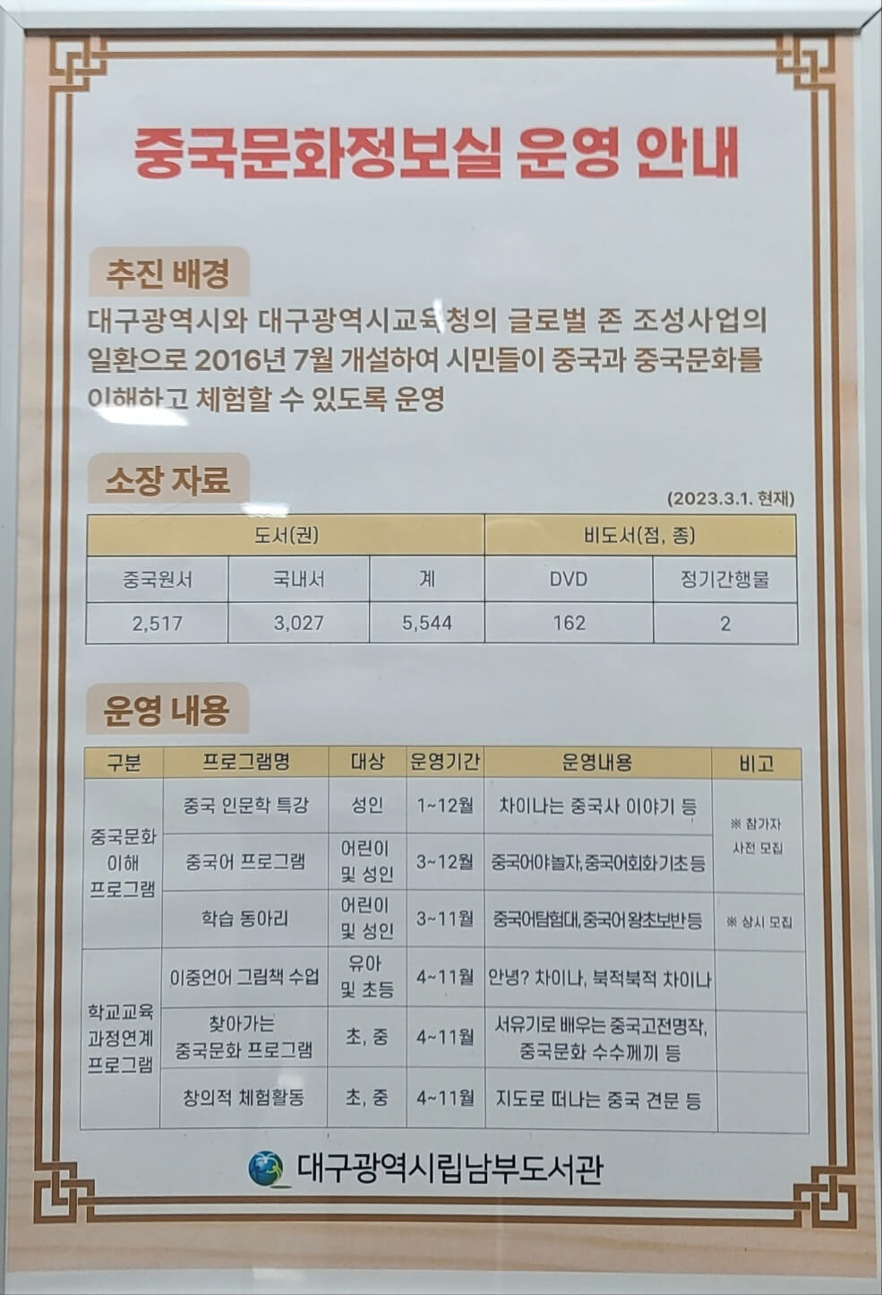 중국문화정보실, 전시실은 한 공간에 위치해 있습니다. 중국문화정보실은 중국에 관한 각종 정보가 보관되어 있고 특정한 시간에는 중국어 회화등 다양한 교양강좌가 열리고 전시실은 작가들의 작품이 전시되고 있습니다.