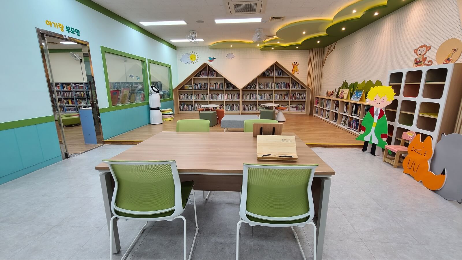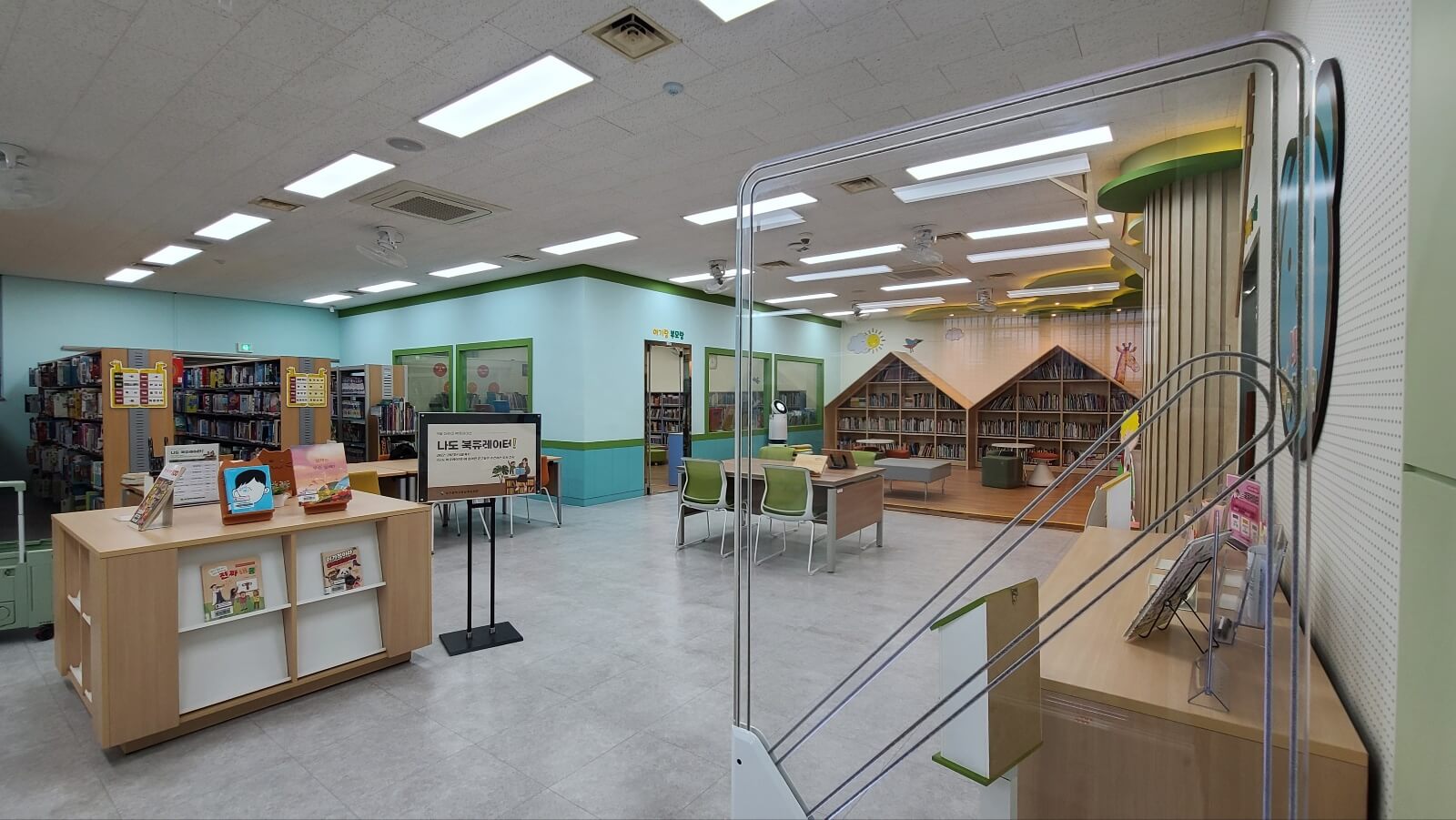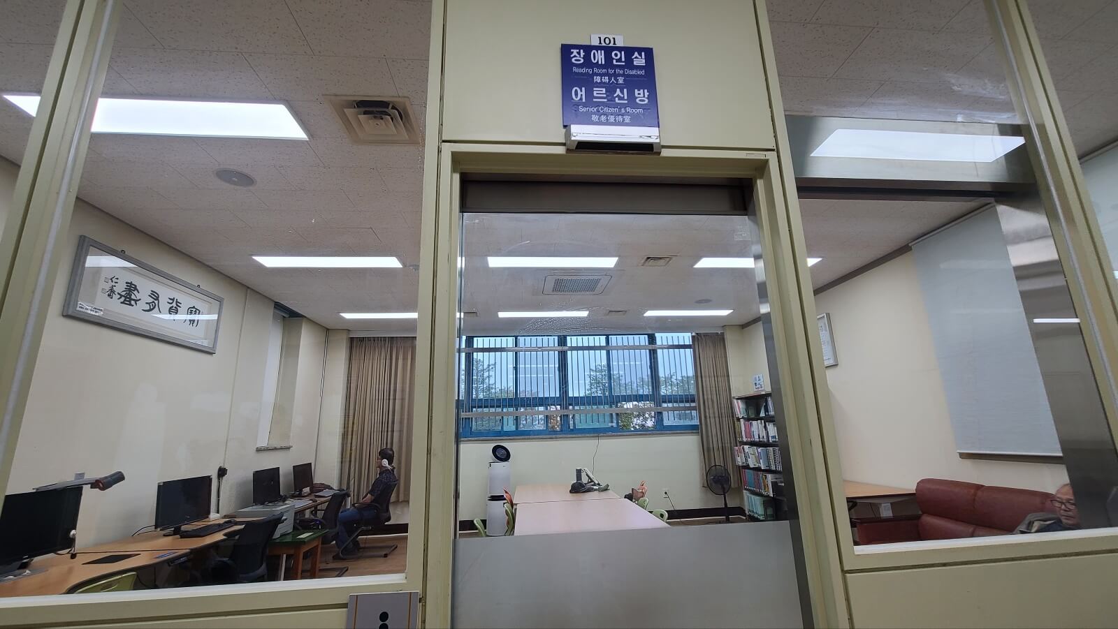 신발을 벗고 들어가는 자료실이 별도로 있어 어린이들이 부모님과 함께 누워서 책 보기도 가능한 공간입니다. 어린이 자료실 들어가기 전에 어르신 자료실이 따로 있어 할아버지 두 분이 책을 읽고 계셨습니다.,