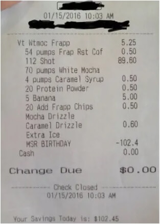 사실 위의 이야기는 아이들이 장난친 것 같은 사례에 불과합니다. 더 나아가 전 세계에서 가장 비싼 가격을 찍었던 사람은 토마스라는 사람이며, 음료의 가격은 무려 102.04달러라고 합니다. 생일 쿠폰으로 전액 면제받았다고 하는데요.