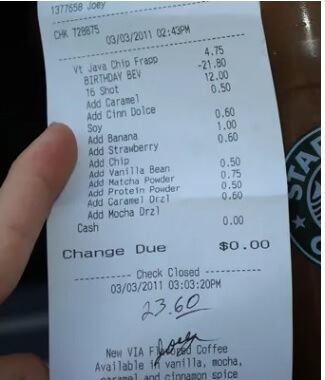 내 마음대로 엑스트라를 바꿀 수 있다는 점을 이용하여 팁 포함 한잔에 $23.60를 찍은 창의력 끝판왕이 있었습니다. Logan A. Warren이라는 사람인데, 어떤 엑스트라, 사이즈, 음료든 무료로 먹을 수 있는 스타벅스 생일 무료 쿠폰을 이용하여 어떻게 하면 가장 비싼 음료를 마실 수 있는지 라는 호기심에 출발해서, 웃음을 참아가며 바리스타랑 30분 동안 고민해서 창의력을 발휘해 만들었다고 합니다.