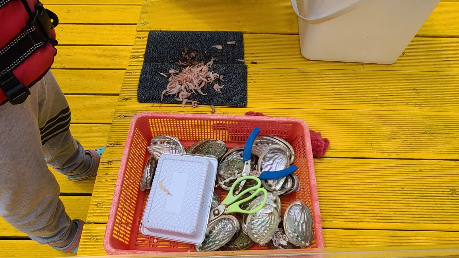 전복껍데기는 머에 쓰는 물건인고? 했더니 새우를 떠 가는 그릇으로 사용됩니다