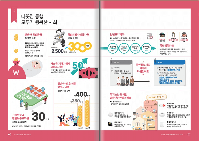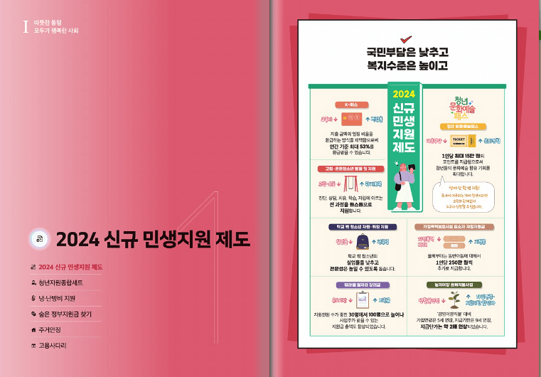 2024 신규 민생 지원제도 청년 지원 종합세트 냉난방비 지원과 숨은 정부 지원금 찾기 등으로 약 260페이지 걸쳐 광범위하게 만들어어 있습니다
